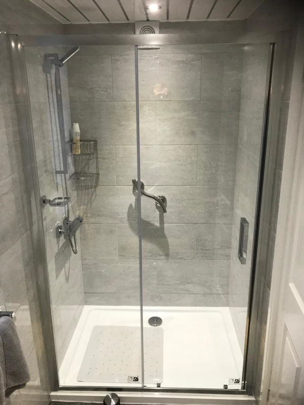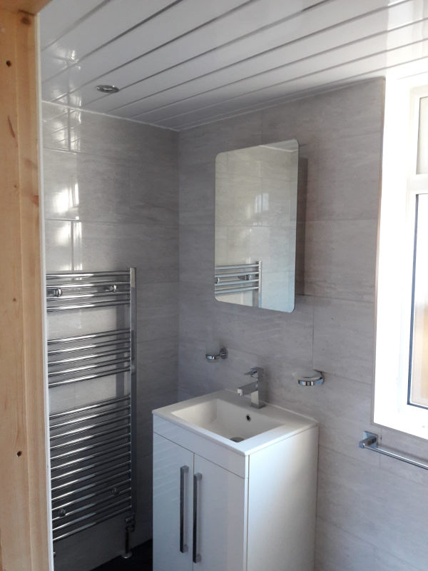 As the garage was being converted to create two rooms an internal wall with door was fitted. The room at the far end of the garage became the en-suite and this was kitted out with a walk-in shower, radiator and sink with storage unit underneath. The walls were covered from floor to ceiling with grey tiles and grey grout and the ceiling was panelled. All electrics were undertaken and completed including fixtures and fittings and ceiling lights. You can see the original garage and the process we followed to convert it from the photographs included.